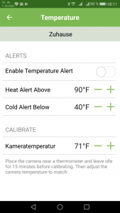 Ein eingebauter Sensor misst die Raumtemperatur und gibt diese ebenfalls an die App weiter. Diese Funktion befindet sich laut Blink aber noch im Betastadium. Das merkt man, denn derzeit wird die Temperatur nur in hier unüblichen Grad Fahrenheit angezeigt, ein Umschalten auf Grad Celsius ist derzeit noch nicht möglich. Das allerdings dürfte nur eine Frage der Zeit sein, bis dieses Problem über ein Firmwareupdate behoben wird. Interessanterweise kann man auch eine Minimal- und Maximaltemperatur angeben. Wir diese erreicht, sendet die App auf Wunsch eine Push-Nachricht an den Nutzer. Die Kameratemperatur lässt sich übrigens auch kalibrieren und damit bei Bedarf noch anpassen. Auch das ist derzeit leider nur in Grad Fahrenheit möglich.